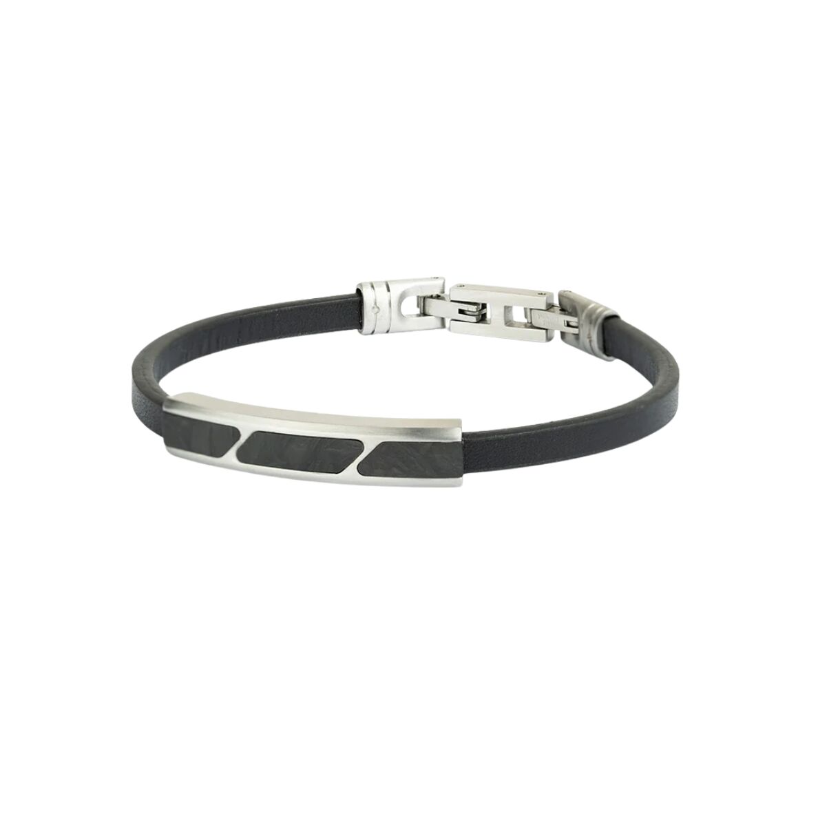 Bracelet en acier, cuir noir et insert en carbone forgé