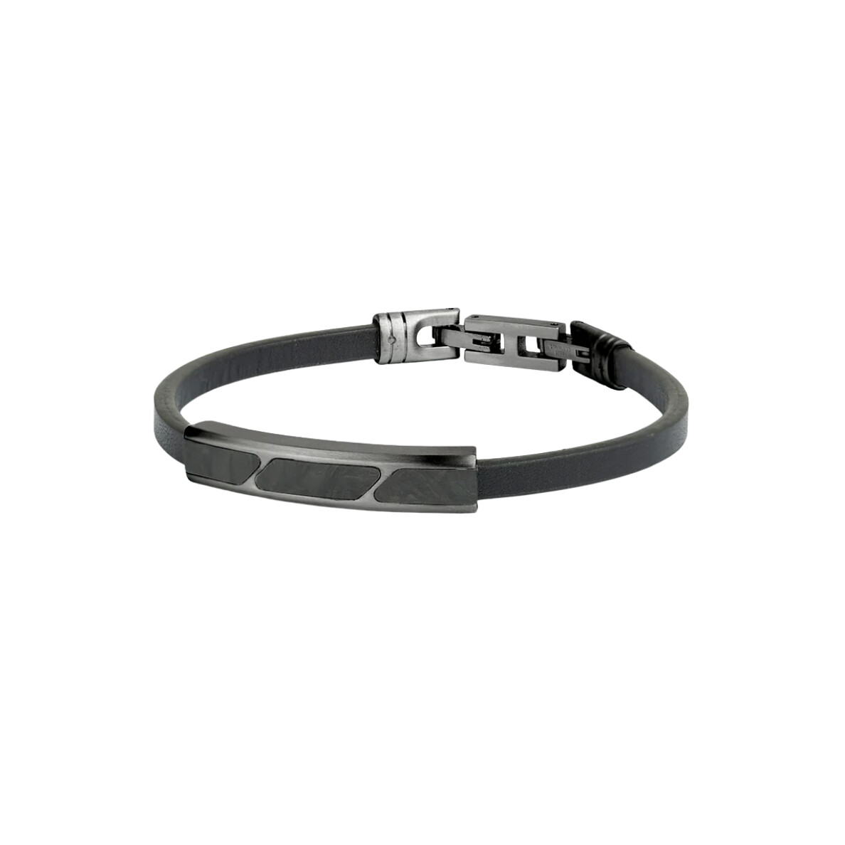 Bracelet en acier pdv noir, cuir noir et insert en carbone forgé