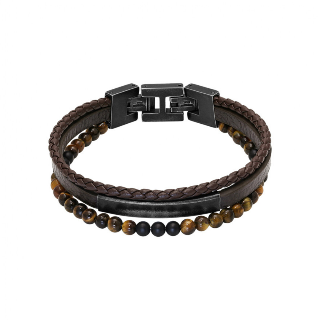 Bracelet en acier vintage, cuir marron, œil de tigre et agate