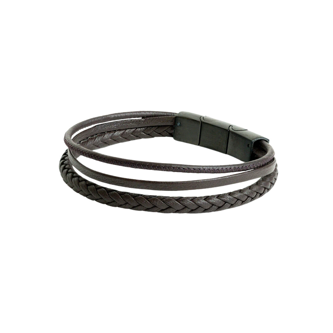 Bracelet triple en cuir marron et fermoir acier pvd noir