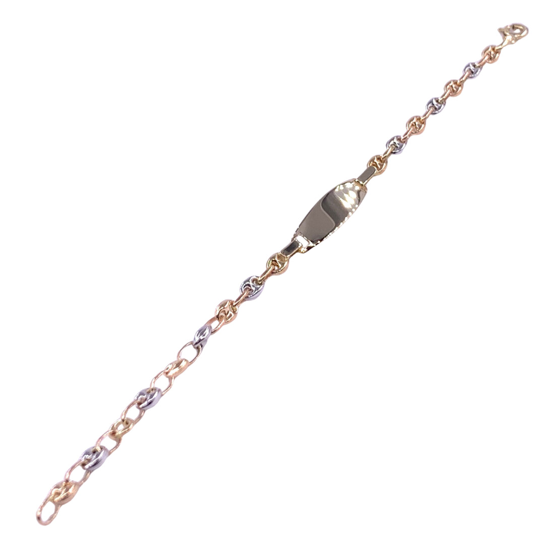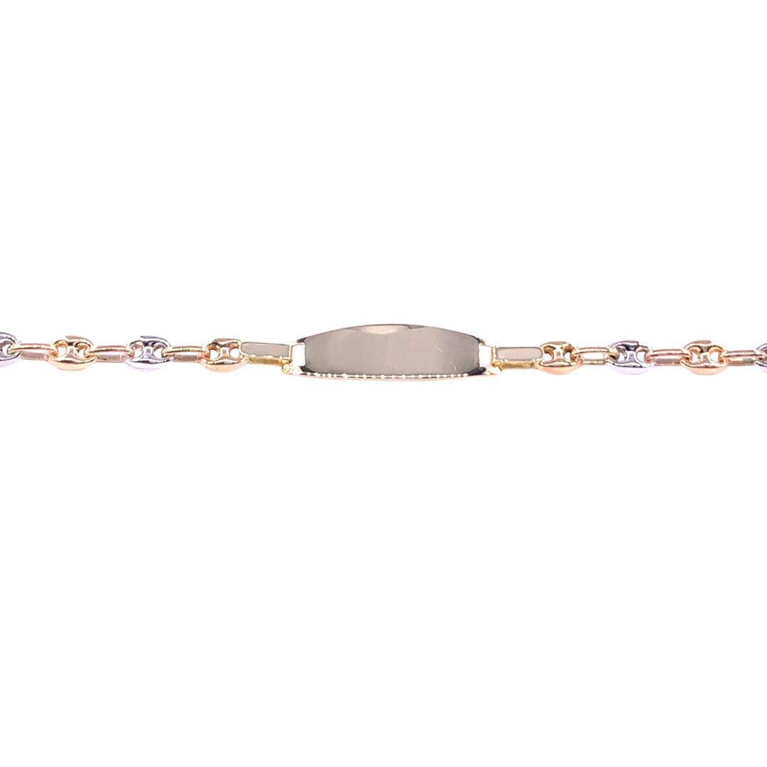 Bracelet identité en or jaune maille grain de café tricolore, plaque tonneau