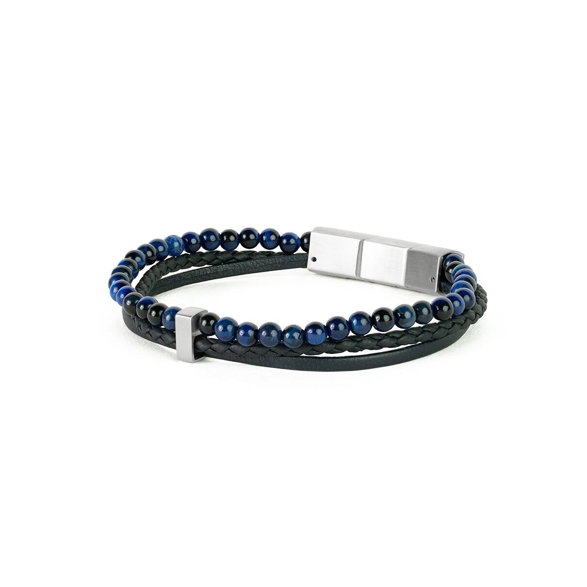 Bracelet triple en cuir noir, "œil de tigre bleu" et fermoir en acier